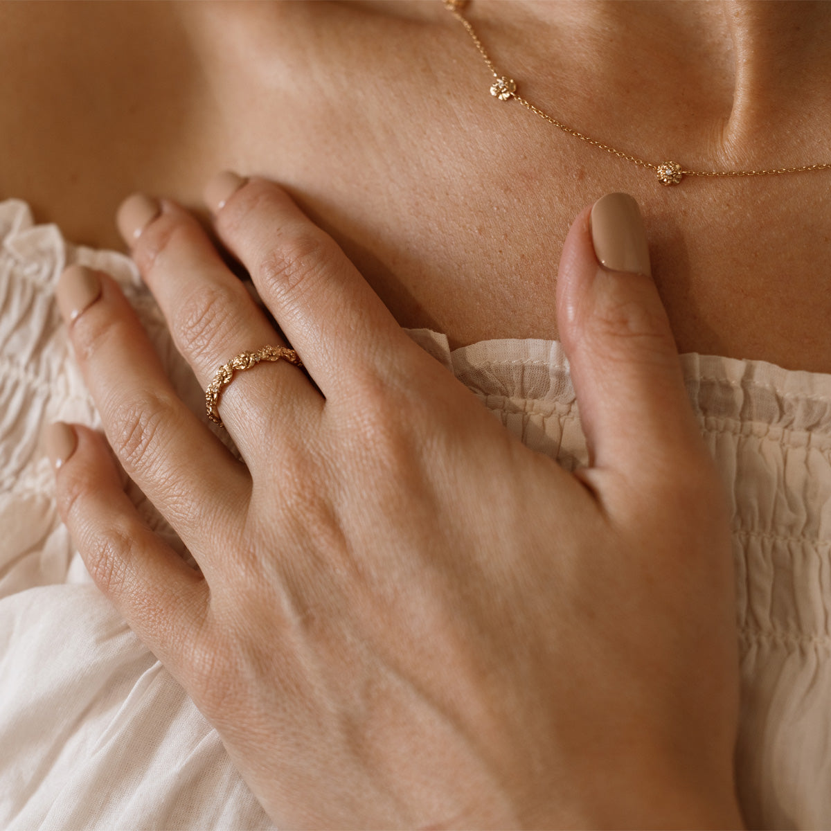 Pretty little blooms, all lined in a row. This eternity band features lifelike January carnation silhouettes, sparked with CZ stones for a diamond-like glint. A quiet bloom of intuition, deep thought, and steady confidence, this full-circle design is a stand-alone statement or the perfect layering piece. Durable enough for 24/7 wear and meaningful enough to carry every day.