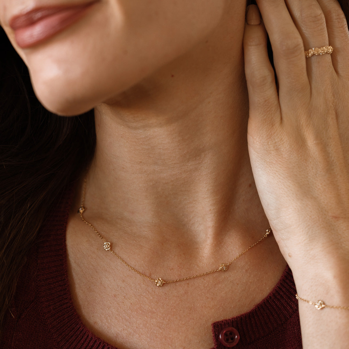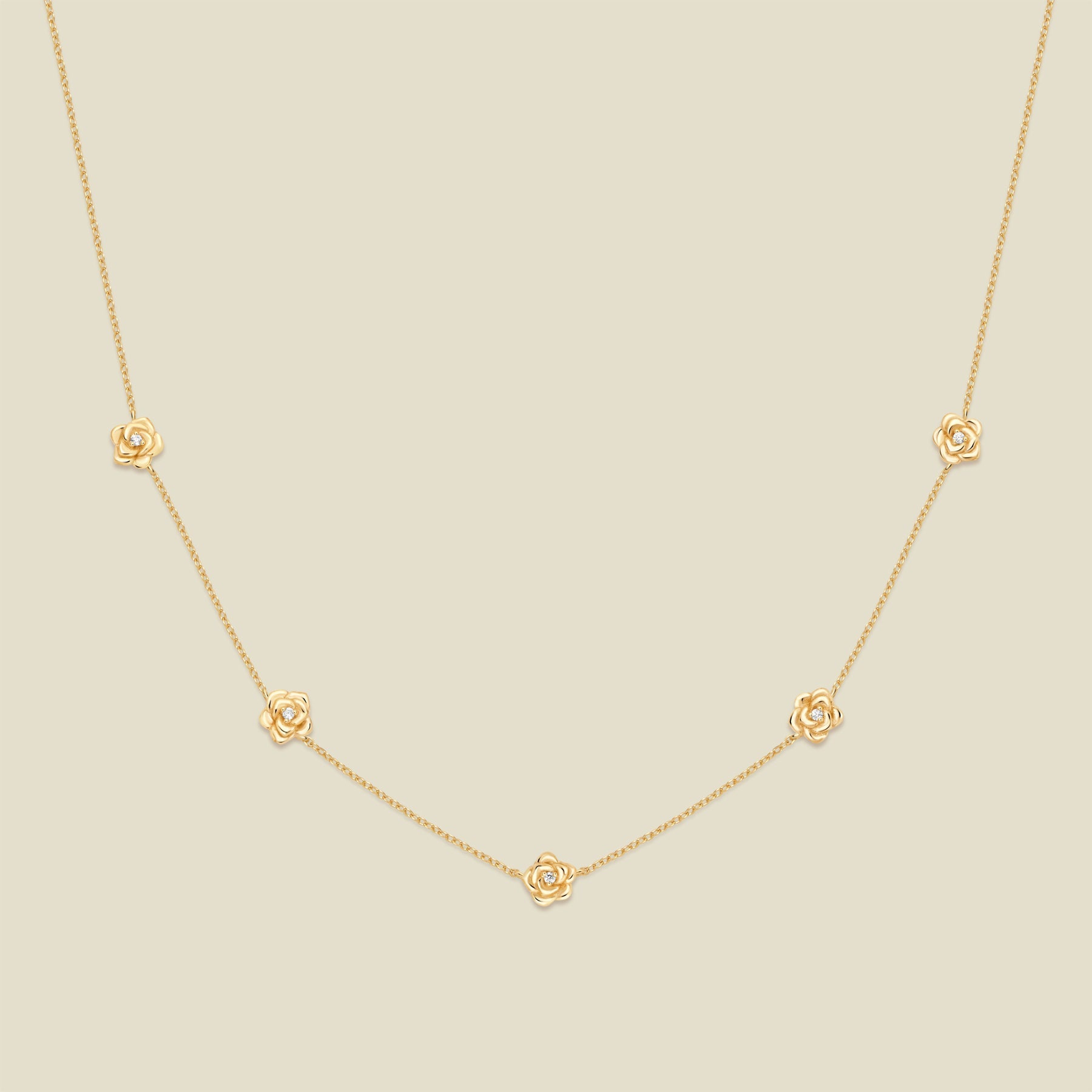 Your story, in bloom. This dainty necklace features lifelike June rose silhouettes set with subtle CZ sparkle for just the right amount of shine. A symbol of love, purpose, and the pursuit of what calls to you, this necklace rests near your heart as a reflection of devotion and meaning. Elegant on its own or layered with your go-to pieces, perfect for marking a milestone or moment.
